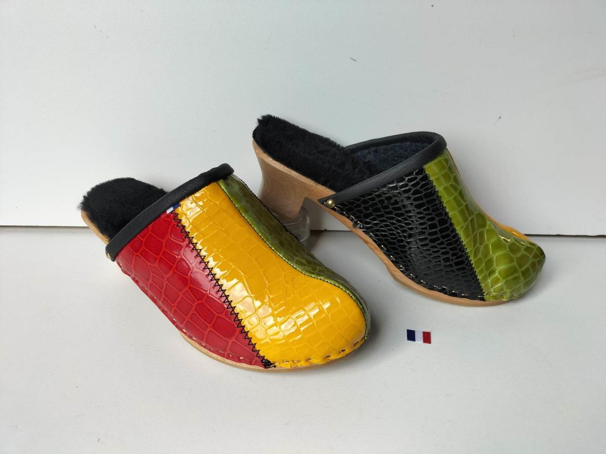 - modèle hiver avec 3 coloris de cuir imitation croco , fourrure intérieur synthétique , bordure coup de pied en cuir , semelle bois vernie + patins antidérapants , hauteur talon 4.5 cm , sur commande