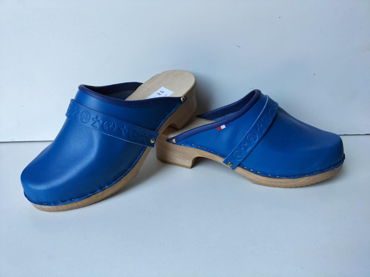 - suédois de couleur bleu , cuir épaisseur 2.2mm , finition coup de pied bordure veau noir ou bleu ( selon arrivage cuir) semelle bois vernie avec patins antidérapants , indiquer la mesure pied à la commande , fabrication à la commande
