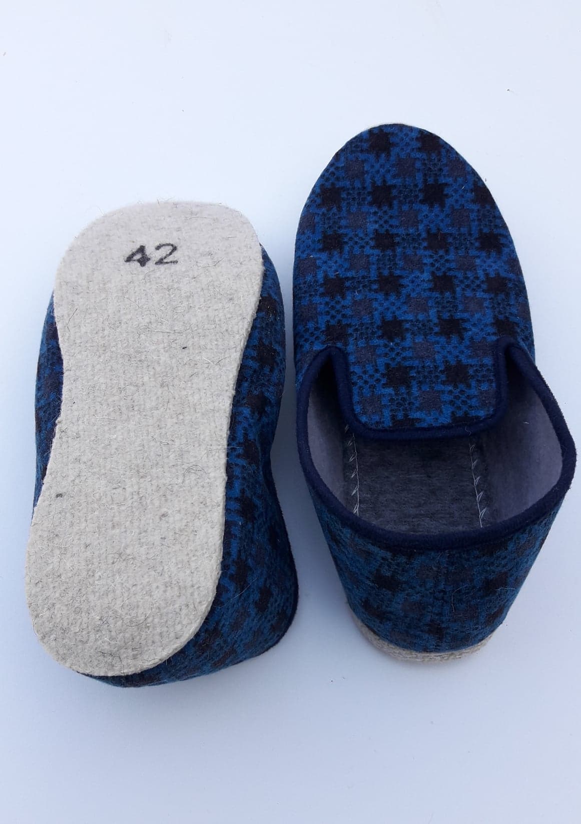 - chausson feutre ( 3 chaines ) 1 er prix avec semelle feutre , toute saison non fourré , couleur imprimé bleu pied de poule, fabrication française stock limité